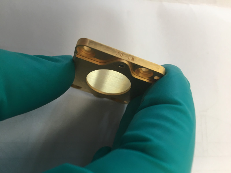 Secondly, the corrugated feed horn operating around 600 GHz which defines the beam entering the lower frequency receiver. The horn is unusual in that it contain a 90 degree waveguide twist required by the relative orientation of the polarizing wire grids and the 600 GHz receiver mixer. The complex internal structure of the horn is made by electroforming - copper plating - onto an aluminium former, or mandrel, and then dissolving out the aluminium using Sodium Hydroxide.